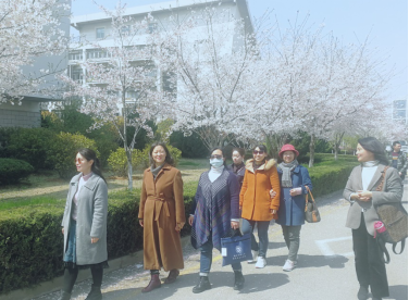 天气晴朗,春风荡漾,女教师们笑逐颜开,一边欣赏校园樱花美景,一边畅谈公司美好未来,有的老师忍不住举起手机拍下美好瞬间。