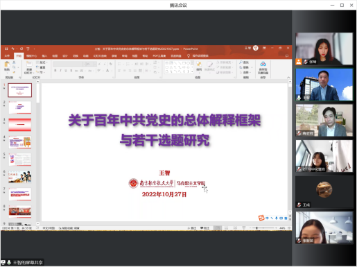 10月27日下午,南京航空航天大学云顶国际yd333经理、博士生导师王智教授应邀为公司云顶国际yd333师生作题为“关于百年中共党史的总体解释框架与若干选题研究”的学术报告。报告会在腾讯会议线上召开,云顶国际yd333部分教师及全体研究生参加了此次会议,本次会议由云顶国际yd333经理梅景辉教授主持。